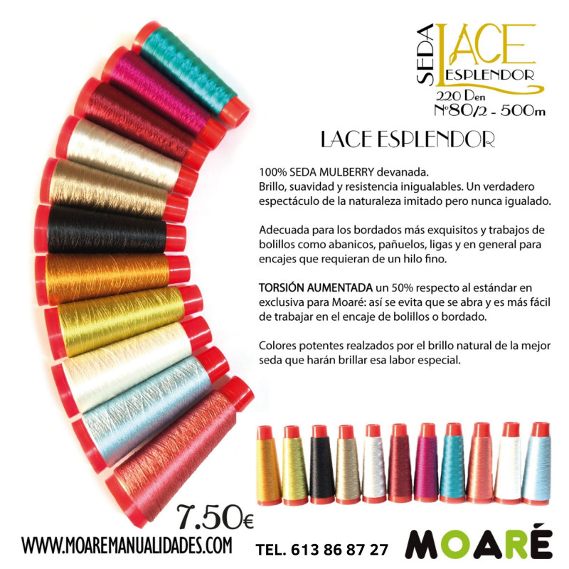 Adecuada para los bordados más exquisitos y trabajos de bolillos como abanicos, pañuelos, ligas y en general para encajes que requieran de un hilo fino.