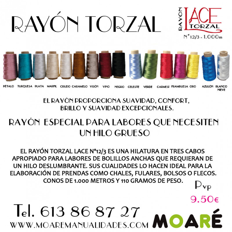 El Rayón Torzal LACE Nº12/3 es una hilatura en tres cabos apropiado para labores de bolillos anchas que requieran de un hilo deslumbrante. Sus cualidades lo hacen ideal para la elaboración de prendas como chales, fulares, bolsos o flecos  de encaje de bolillos.
